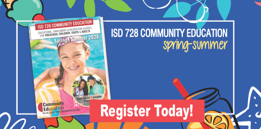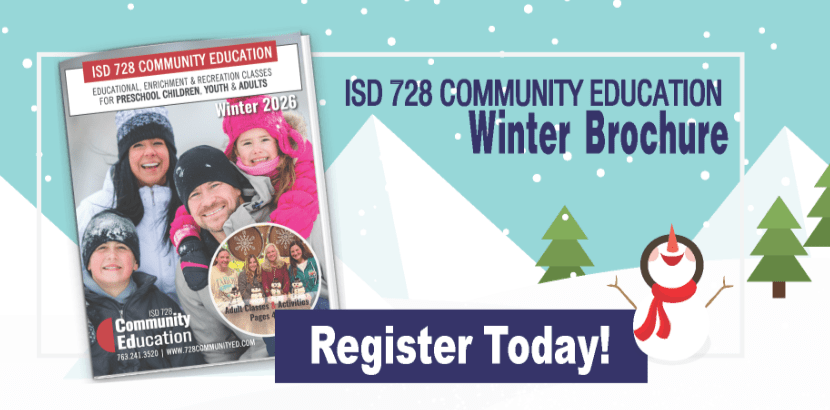 Click Here toVIEW OUR BROCHURE! Get in TouchCommunity Education Office:763-241-3520, or communityed@isd728.orgFacilities Office: 763-241-3400x5539 or facilities@isd728.orgEdVenture Club Office: 763-241-3544 or edventureclub@isd728.orgDiscovery Learning Preschool Office:763-241-3524, or ECFE@isd728.org Join our mailing list! Sign up to join our mailing list and the next brochure will be mailed to your home. Sign up ISD 728 Community Education 1170 Main Street, Elk River MN 55330 | 763.241.3520